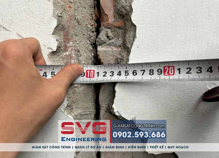 - Các kỹ sư xây dựng SVG Engineering thực hiện việc kiểm tra bằng mắt thường và thước đo các vết nứt tường, biến dạng của cấu kiện (Cột, dầm, sàn), mối nối, bu lông.